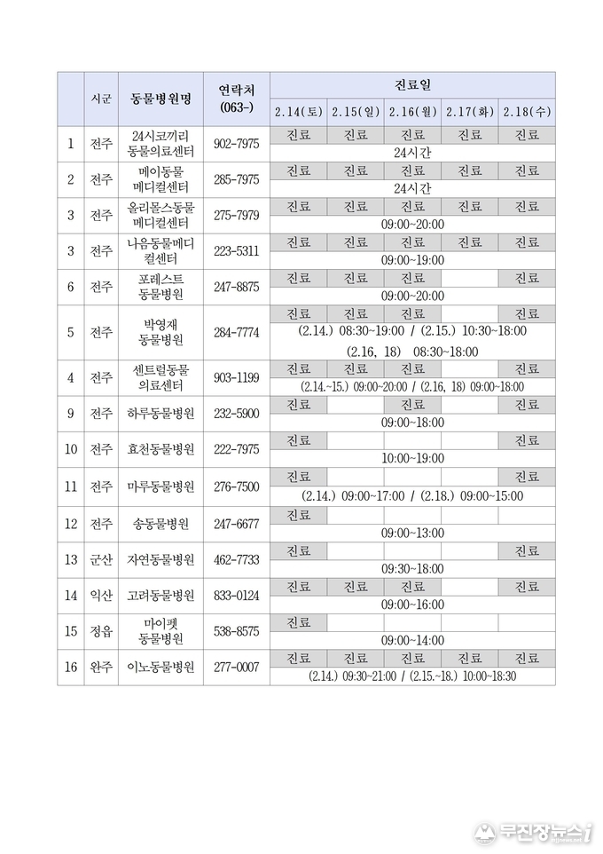 이와 함께 연휴 중 반려동물이 갑작스럽게 아프거나 사고를 당할 경우에 대비해 도내 응급 동물병원 15개소가 진료를 실시한다. 이 가운데 전주 지역 2개소는 24시간 운영돼 야간이나 심야에도 응급 진료를 받을 수 있다.
