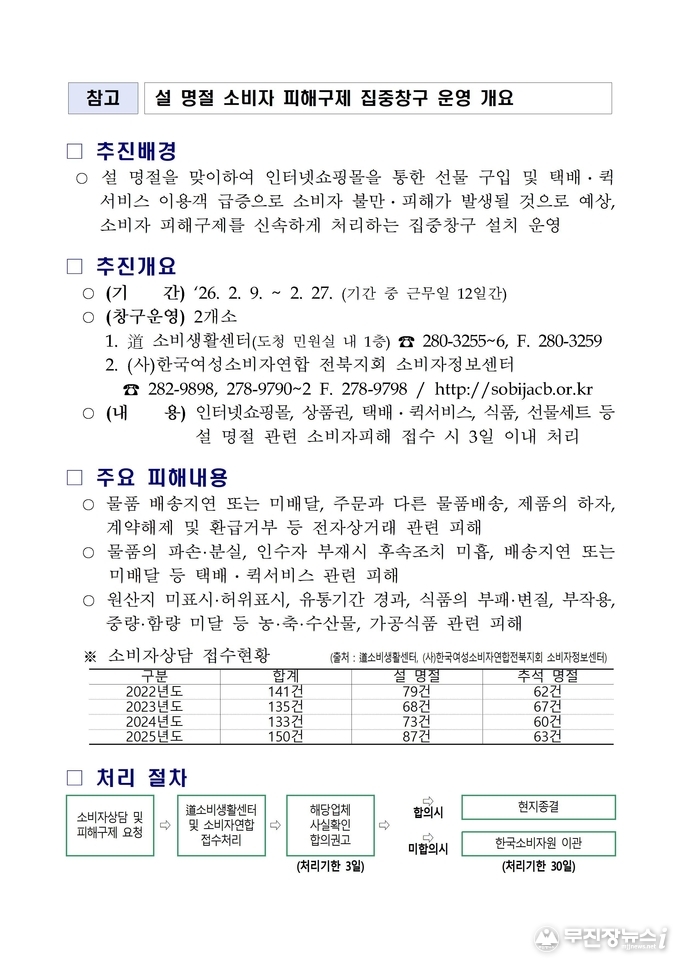 전북특별자치도 관계자는 “설 연휴 이후에도 배송 지연이나 품질 하자 관련 피해가 이어질 수 있는 만큼, 문제가 발생하면 지체 없이 집중창구를 통해 상담받길 바란다”고 말했다.