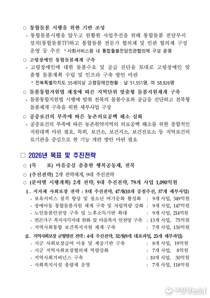 도는 제5기(2023~2026) 지역사회보장계획의 마지막 해를 맞아 79개 세부사업을 추진하며 ‘마을중심 촘촘한 행복공동체, 전북’ 실현에 속도를 낼 계획이다.