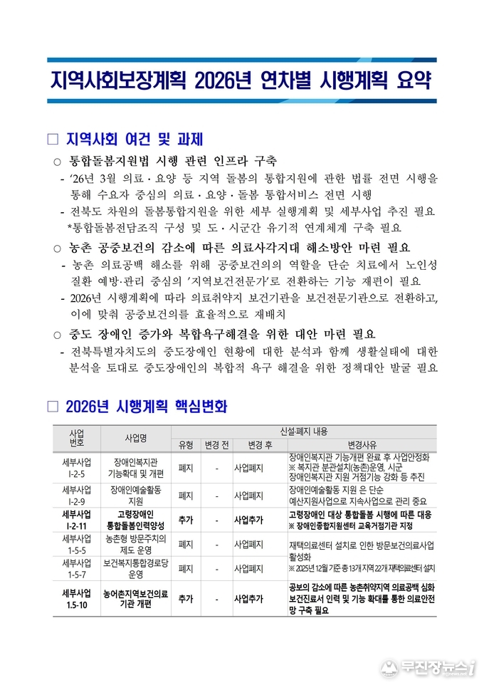 양수미 전북자치도 사회복지정책과장은 “2026년 시행계획은 제5기 지역사회보장계획의 마무리 단계로, 그간의 성과를 종합·발전시키는 중요한 시기”라며, “돌봄통합지원법 시행 등 급변하는 제도 환경 속에서 누구도 소외되지 않는 촘촘한 전북형 복지 안전망을 완성해 나가겠다”고 밝혔다.