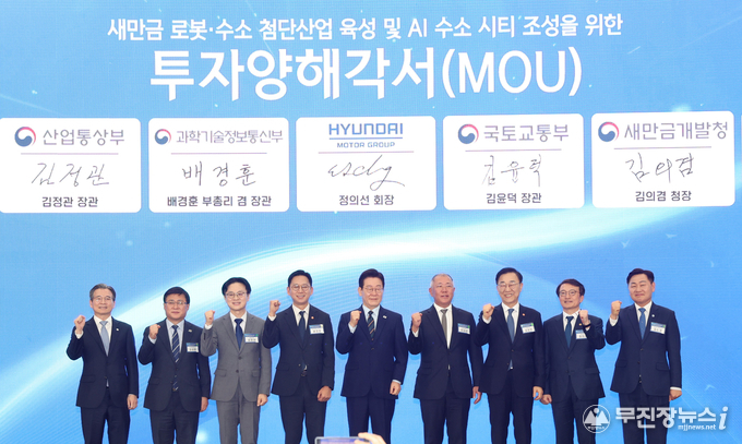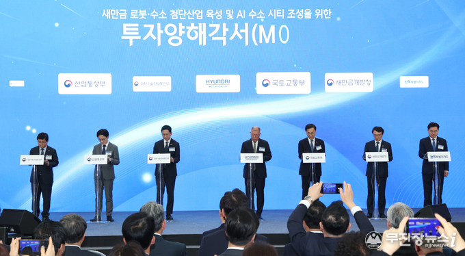 도는 27일 군산 새만금컨벤션센터(GSCO)에서 현대자동차그룹, 정부 5개 부처와 함께 '새만금 로봇·수소 첨단산업 육성 및 수소AI 도시 조성을 위한 투자협약(MOU)'을 체결했다. 이번 협약은 정부 부처, 광역지자체, 민간기업이 단일 투자 건에 공동 서명한 사례이며, 이는 전국적으로 전례가 드물다. 정부가 새만금을 국가 차원의 미래산업 실증 거점으로 공인한 것으로도 해석된다.