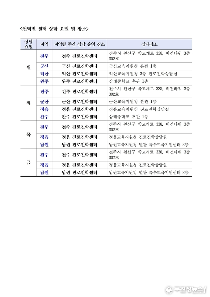 진로·진학 상담은 전주와 군산, 익산, 정읍, 남원, 완주 등 전북교육청이 6개 권역에 설치한 진로진학센터에서 진행된다.