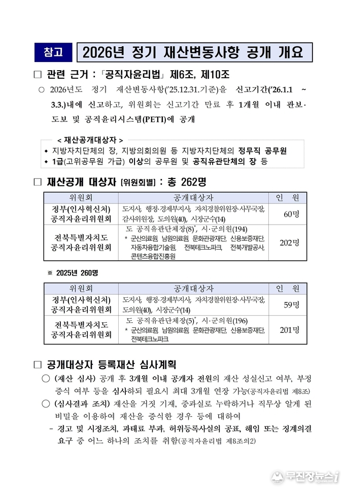 전북특별자치도 공직자윤리위원회가 2026년도 정기 재산변동 사항을 26일 전북특별자치도보를 통해 공개했다. 이번 재산공개 내역은 26일 0시부터 확인할 수 있다.