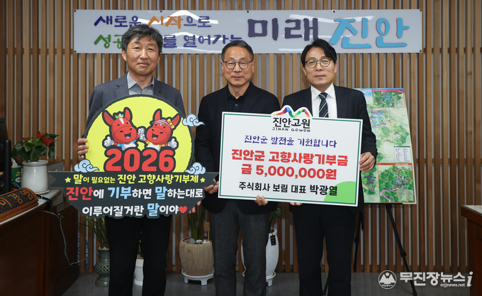 진안군 관계자는 “진안군을 사랑하는 마음으로 큰 뜻을 실천해주신 기부자께 깊이 감사드린다”며 “기부금은 기부자의 뜻에 따라 지역 발전과 복지 향상에 소중히 활용하겠다”고 말했다.