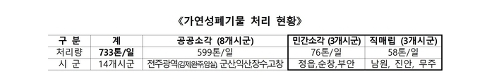 전북도는 2024년 기준 하루 1,704톤의 생활폐기물이 발생하고 있으며, 이 중 소각 대상 폐기물은 733톤이다. 이 가운데 공공 소각시설에서 하루 599톤을 처리하고 있으며, 소각시설이 없는 시군은 민간 소각으로 76톤, 직매립으로 58톤을 처리하고 있다.