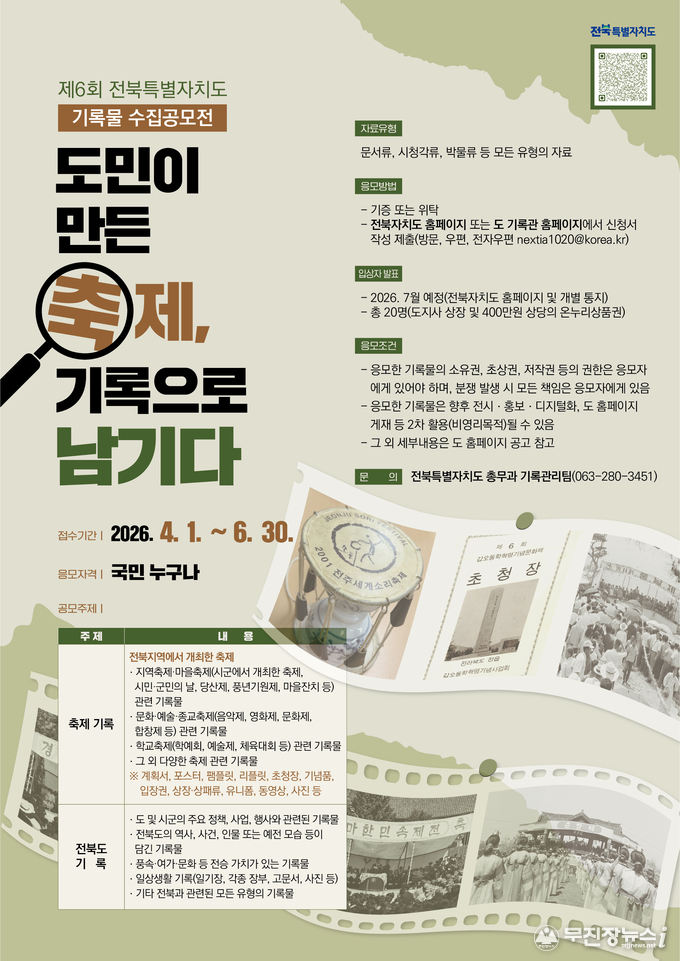 전북특별자치도는 지역의 문화와 정체성을 담은 민간기록물을 발굴·보존하기 위해 ‘제6회 전북특별자치도 기록물 수집 공모전’을 개최한다고 1일 밝혔다.