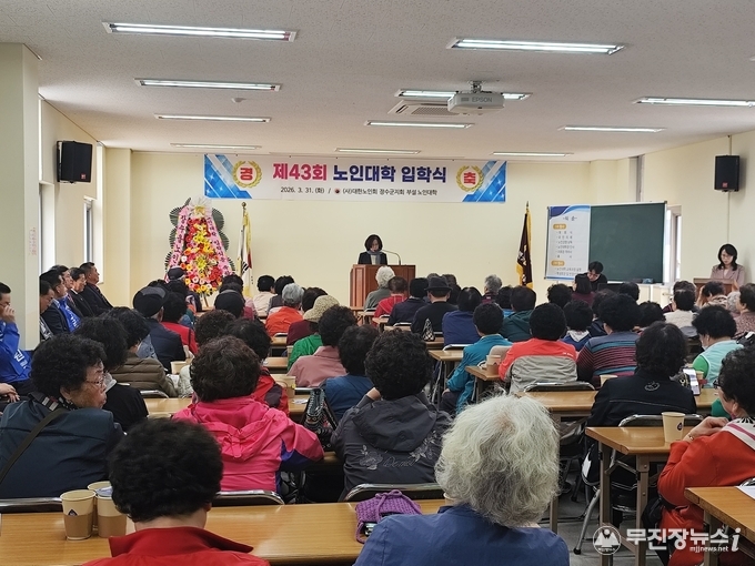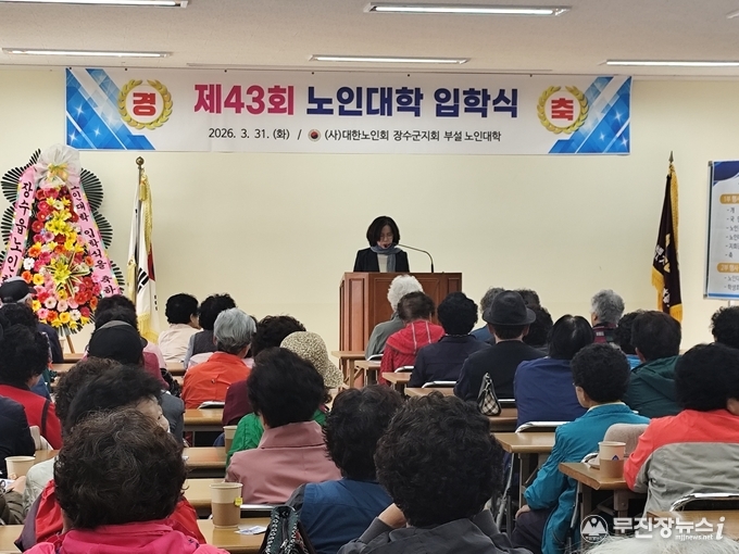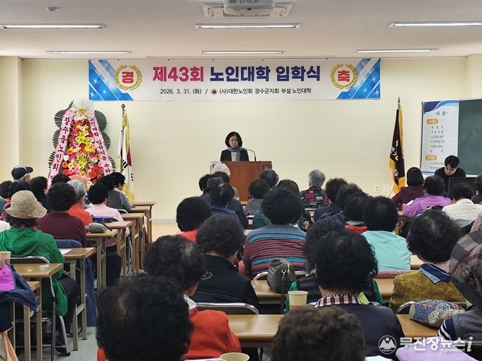 장수군은 지난 31일 사회복지회관 2층 강의실에서 신입생 어르신과 내빈 등 120여 명이 참석한 가운데 제43회 노인대학 입학식을 개최했다고 밝혔다.