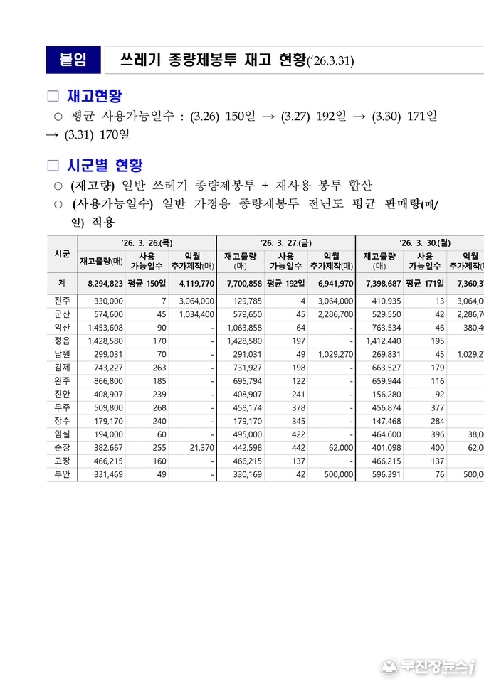 도에 따르면 3월 31일 기준 도내 평균 종량제 봉투 재고는 약 170일분으로, 지난 3월 26일 점검 당시 150일분보다 사용 가능 일수가 늘어났다. 이는 전주시와 군산시 등 주요 시군이 종량제 봉투를 매주 제작·공급하면서 전반적인 수급이 안정적으로 유지되고 있기 때문이다.