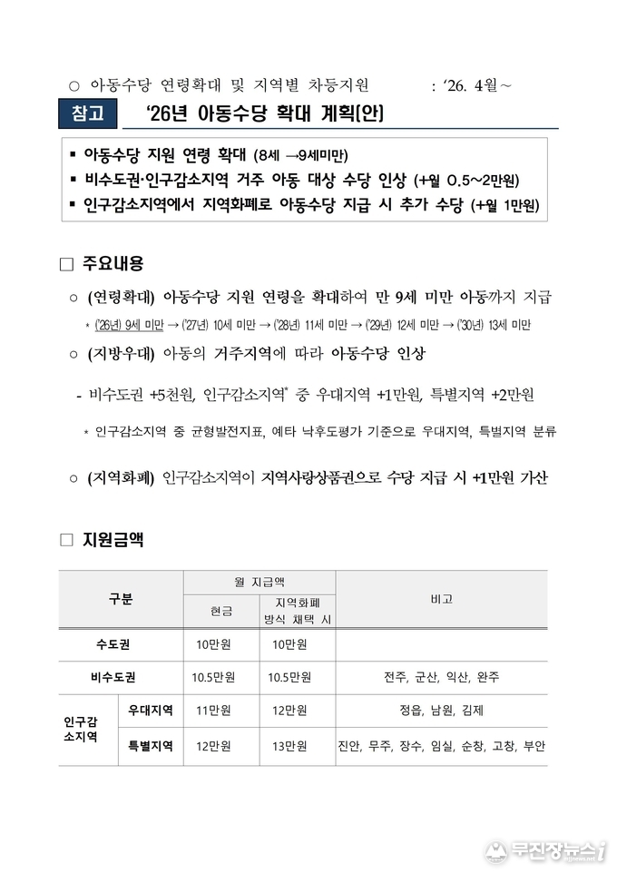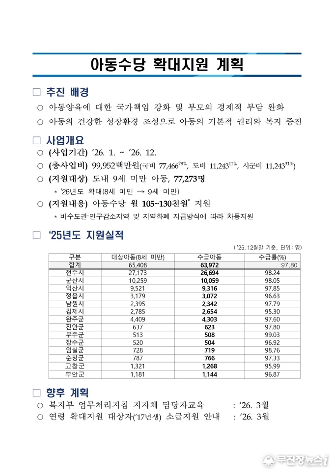 이미숙 전북자치도 여성가족과장은 “아동수당 확대와 소급 지원이 양육 가정의 실질적인 부담 완화로 이어질 수 있도록 시군과 협력해 안내와 행정 지원을 강화하겠다”고 말했다.