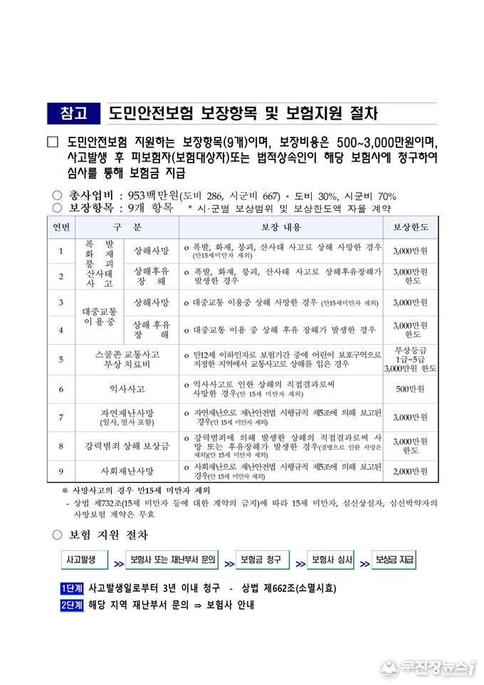 이 보험은 시·군이 운영하는 시민안전보험 형태로 추진되며, 폭발·화재·붕괴·산사태 사고, 대중교통 사고, 스쿨존 교통사고, 익사, 강력범죄 상해, 자연재난 및 사회재난 사망 등 총 9개 항목을 보장한다. 보상금은 항목별로 최대 500만 원에서 3,000만 원까지 지급된다.