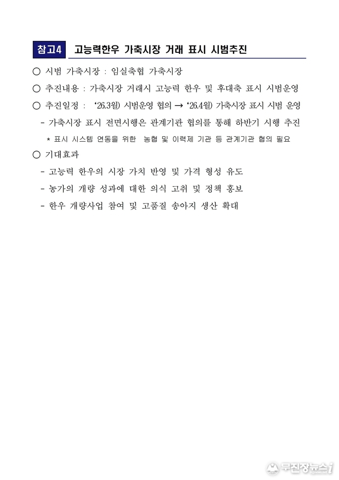 민선식 전북자치도 농생명축산산업국장은 “고능력 한우 표시제는 과학적 개량의 성과를 시장에서 제대로 평가받기 위한 첫걸음”이라며, “좋은 소를 키운 농가가 정당한 가격을 받을 수 있는 환경을 조성해 한우 산업의 경쟁력을 높여 나가겠다”고 밝혔다.