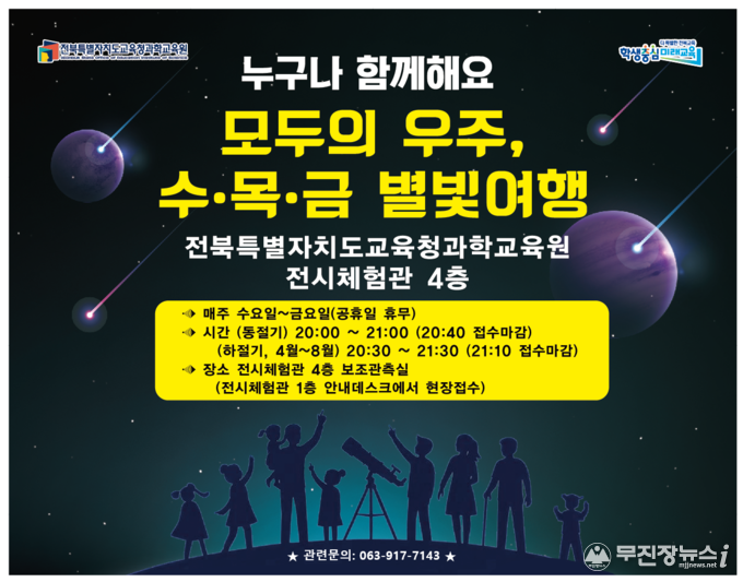 전북특별자치도교육청과학교육원(원장 강진순, 이하 과학교육원)은 4월 과학의 달과 봄을 맞이해 도민들에게 밤하늘의 신비로움을 선사하고자 ‘봄철 별자리와 함께하는 수·목·금 별빛여행’을 운영한다.