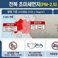 전북특별자치도 보건환경연구원은 25일 오전 전북 서부권과 중부권에 국외 오염물질 유입의 영향으로 초미세먼지(PM-2.5) 농도가 높아지며 초미세먼지 주의보를 발령했다고 밝혔다. 초미세먼지(PM-2.5) 주의보는 시간 평균 농도가 2시간 이상 75㎍/㎥을 넘길 때 발령된다. 이날 서부권역은 오전 9시 99㎍/㎥, 10시 84㎍/㎥, 중부권역은 오전 10시 81㎍/㎥, 11시 83㎍/㎥를 기록하며 기준치를 초과했다. 이번 주의보는 중부와 남서부 지역을 중심으로 오전까지 국외 미세먼지가 유입되면서 발령된 것으로 분석된다. 오후부터는 북서쪽에서 비교적 청정한 기류가 유입되며 농도가 점차 낮아질 것으로 예상된다. 전경식 보건환경연구원장은 “공기 중 초미세먼지와 미세먼지 농도가 높아지면 어린이와 노약자, 호흡기·심장 질환자 등 민감군은 물론 일반인도 가급적 실외활동을 자제해야 한다”며 “부득이하게 외출해야 할 경우에는 마스크와 보호안경 등을 착용하고, 대기오염 저감을 위해 차량운행도 가급적 줄여 달라”고 당부했다. 아울러“전북특별자치도 실시간대기정보시스템(http://air.jeonbuk.go.kr)을 통해 대기환경정보 확인과 예․경보 상황을 알림톡 등으로 받아볼 수
