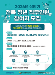 전북특별자치도와 전북창조경제혁신센터가 ‘2026년 상반기 전북 청년 직무인턴’ 참여자를 11월 26일까지 모집한다. ‘전북 청년 직무인턴’은 도내 공공기관과 기업에서의 실무형 직무 체험을 통해 청년들의 취업 준비와 진로 탐색을 지원하는 전북 대표 청년 일자리 프로그램이다. 2017년부터 운영해오며 현장 경험 중심의 역량 강화 모델로 자리 잡았다. 올해에는 상하반기 총 433명이 참여했으며, 내년 상반기에는 전북은행, 전북국제협력진흥원, 전북신용보증재단 등 42개 기관·기업에서 215명의 청년이 참여할 예정이다. 선발된 인턴은 2026년 1월 12일부터 2월 13일까지 5주간 직무 체험을 진행하며, 배치 전 실무 적응과 취업 준비를 위한 사전 교육도 제공된다. 도는 이번 프로그램을 통해 청년들이 실제 근무 환경을 경험하며 직무 이해도와 경험 기반의 취업 경쟁력을 높일 수 있을 것으로 기대하고 있다. 참여 신청은 전북 청년 직무인턴 공식 누리집(www.jbintern.or.kr)을 통해 온라인으로만 가능하다. 한편, 2025년 하반기 모집에는 1,026명이 지원하는 등 매년 높은 경쟁률을 보이며 도내 청년들로부터 꾸준한 관심과 호응을 얻고 있다. 김인태 기업유치