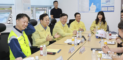 김윤덕 국토교통부 장관과 김관영 전북특별자치도지사가 19일 오전 전주 한진택배 서브터미널에서 추석 특별관리기간 운영 계획을 보고 받고 택배기사들의 애로사항 및 분류작업장과 터미널 현장을 점검하고 있다.