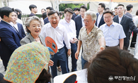 문재인 전 대통령이 5일 제8회 전주독서대전이 열리는 전주 한옥마을을 방문하여 김관영 전북특별자치도지사와 문승우 도의장, 우범기 전주시장과 함께 북마켓 부스를 순회하며 인사를 나누고 있다.