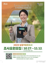 장수군은 ‘2025 농림어업총조사’의 원활한 추진을 위해 27일부터 다음 달 12일까지 조사요원을 모집한다고 밝혔다 농림어업총조사는 전국의 모든 농림어가를 대상으로 농촌 인구 구조, 농가 경영실태, 기후 대응, 생활 인프라 등을 종합적으로 파악하여 농산어촌 정책 수립의 가장 중요한 기초자료로 활용되는 국가 통계조사다. 본 조사는 11월 20일부터 인터넷 사전조사를 시작으로 12월 22일까지 진행될 예정이다. 장수군은 이번 조사를 위해 △총관리자 1명 △조사지원담당자 2명 △조사관리자 5명 △조사원 40명 등 총 48명의 조사요원을 모집한다. 지원 자격은 만 18세 이상으로 책임감이 투철한 사람이면 누구나 가능하며, 태블릿 PC 등 스마트기기 활용이 가능한 사람을 우대한다. 또한 과거 통계조사 경험자, 전산 자격증 소지자, 장애인, 국가유공자, 저소득층 등은 관련 기준에 따라 우선 채용할 계획이다. 신청은 장수군청 행정지원과 서무후생팀에 직접 방문해 접수할 수 있다. 모집 관련 자세한 사항은 장수군청 홈페이지 고시‧공고란을 통해 확인할 수 있으며, 선발된 조사요원을 대상으로는 본 조사 전 별도의 교육과 실습을 통해 조사 이해도와 정확성을 높일 예정이다. 최훈식