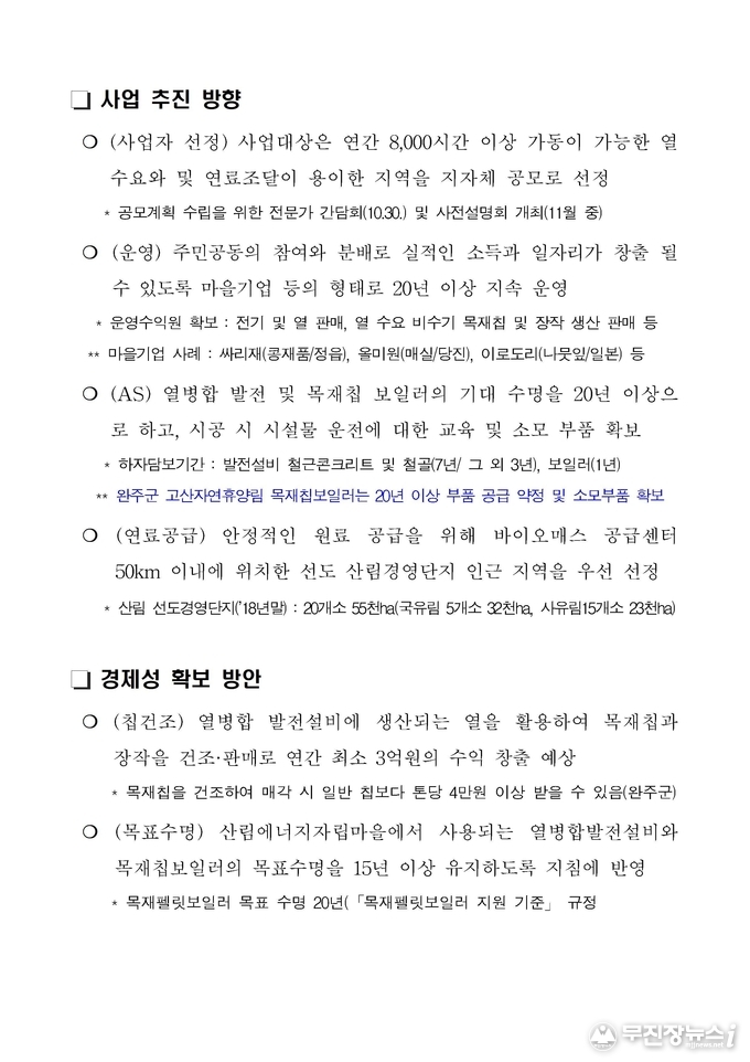 전라북도 환경녹지국장은“산림에너지자립마을사업이 유치되면 완주지역에 안정적인 산림바이오에너지 공급 및 수익 창출이 기대되므로 공모에 선정되도록 최선을 다하겠다”고 말했다.