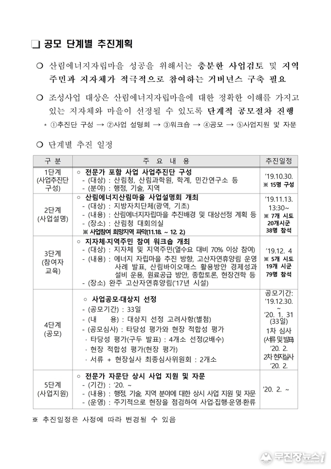 산림에너지자립마을은 1월 말까지 공모 신청서를 접수 후, 서류 및 현지심사를 거쳐 2월 말에 최종 선정될 예정이다.