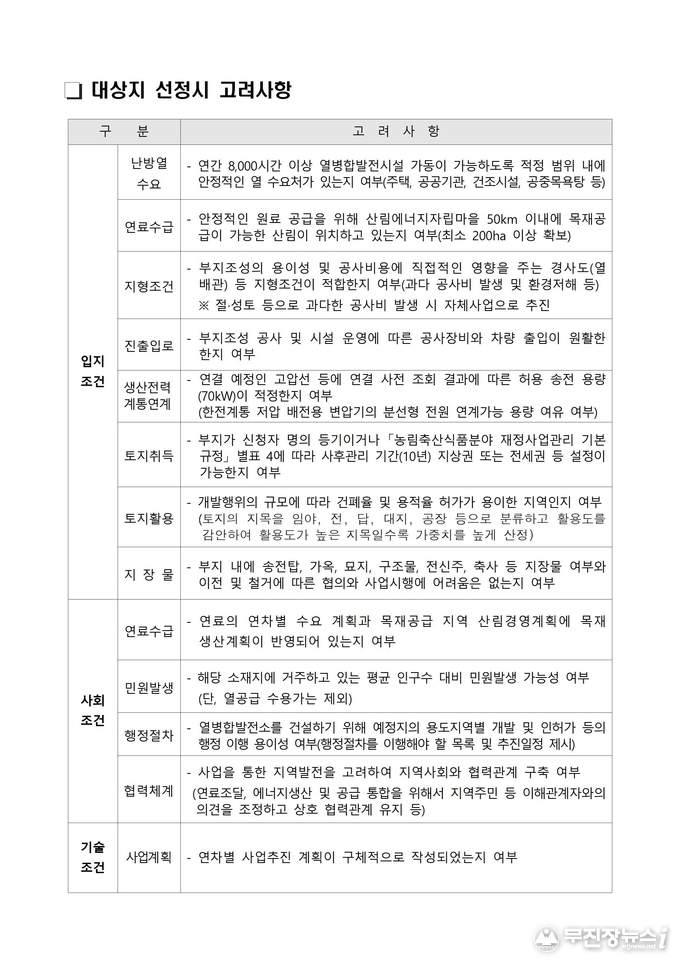 산림청은 대상지 선정 조건으로 연간 8,000시간 이상 가동이 가능한 열 수요와 연료 조달이 용이한 지역, 안정적인 원료 공급을 위해 바이오매스 공급센터로부터 50km 이내에 위치한 선도 산림경영단지 인근 지역 등을 우선 선정한다.