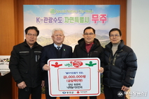 무주군 복숭아 공선회 회원들은 지난 13일 (재)무주군교육발전장학재단에 장학금 558만 5천97원을 기부했다. 이날 방문한 무주 복숭아 공선회(회장 한상철) 및 구천동 복숭아 공선회(회장 양성기) 회원들은 “지역 복숭아 농가들의 뜻을 모아 기부하게 됐다”라며 “학생들을 향한 관심이 이들의 꿈과 희망을 키우는 동력이 되기를 바란다”라고 전했다. 이어 “앞으로도 고품질 복숭아 생산과 유통 경쟁력 강화는 물론, 지역사회와 함께 성장해 나가는 단체가 될 수 있도록 노력하겠다”라고 덧붙였다. 무주 복숭아 공선회는 무주(무주읍, 적상면) 24명, 구천동 지역 23명 등 총 47명으로 구성된 단체로, 적극적인 생육 관리와 급변하는 유통시장 대응을 위해 농협 단위 공동선별 및 공동계산 실천을 원칙으로 해 2021년부터 지난해까지 1천9백여만 원의 장학금을 기탁한 바 있다. //