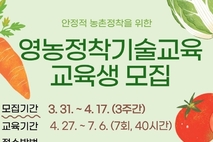 진안군은 신규농업인 및 예비 귀농‧귀촌인을 대상으로 하는 ‘2026 영농정착기술교육’ 교육생을 모집한다. 이 교육은 귀농‧귀촌에 필요한 체계적인 기초 영농기술교육과 선도 농가의 농업정보를 공유함으로써 안정적인 농업‧농촌 정착을 돕기 위해 추진된다. 모집대상은 진안군으로 귀농‧귀촌을 희망하는 신규농업인이거나, 청년농을 비롯한 교육에 관심있는 모든 진안군민이며, 4월 17일까지 온라인 접수 및 방문 접수로 신청하면 된다. 교육 기간은 4월 27일부터 7월 6일까지 기간 중 7회(총 40시간)에 걸쳐 농업 법률상식, 세무회계 실무, 작목별 선도농장 견학, 농기계 실습, 농업 경영계획 수립 등 이론 교육과 현장 교육을 병행하여 운영된다. 농업기술센터 노금선 소장은 "이번 교육이 신규 농업인과 예비 귀농‧귀촌인들이 안정적으로 정착할 수 있도록 현실성 있는 교육 프로그램을 제공하여 다양한 영농 기술 습득과 정보를 공유함으로써, 성공적인 영농정착계획을 수립할 수 있도록 적극 지원하겠다”라고 밝혔다. 교육에 대한 자세한 사항은 진안군농업기술센터 홈페이지에서 확인할 수 있으며 농촌지원과 농업인육성팀(063-430-8623)으로 문의하면 된다.