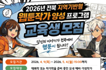 (재)전북특별자치도 콘텐츠융합진흥원(이하 진흥원, 원장 김성규)은 전북 웹툰 산업의 미래를 이끌어갈 인재 발굴을 위해‘2026년 전북 웹툰작가 양성 프로그램’ 교육생 12명을 모집한다고 밝혔다. 본 프로그램은 잠재력 있는 지역 창작자들이 안정적인 환경에서 창작 활동에 전념하고, 실무 역량을 강화해 데뷔 및 연재로 이어질 수 있도록 지원하기 위해 마련됐다. 모집대상은 전북특별자치도에 거주하는 만 19세 이상의 예비·기성작가로, 데뷔를 준비 중이거나 차기작을 계획하고 있다면 지원 가능하다. 선발된 교육생에게는 6개월간 매월 150만원씩, 1인 당 최대 900만원의 창작지원금이 지급된다. 또한, 우수 교육생으로 선정될 경우 최대 90만원의 원고료가 추가 지원된다. 교육과정은 ▲현직 웹툰 작가 및 PD와의 1:1 맞춤형 멘토링(총 70시간) ▲역량강화교육 ▲기업견학 및 비즈니스 상담 ▲국내 웹툰 전시회 참관 지원 등으로 구성된다. 신청 접수는 4월 9일부터 5월 4일 오후 3시까지 진행되며, 지원 희망자는 신청서와 작품기획서, 포트폴리오 등을 이메일로 제출하면 된다. 자세한 사항은 전북콘텐츠융합진흥원 누리집(www.jcon.or.kr)에서 확인할 수 있다. 진흥원