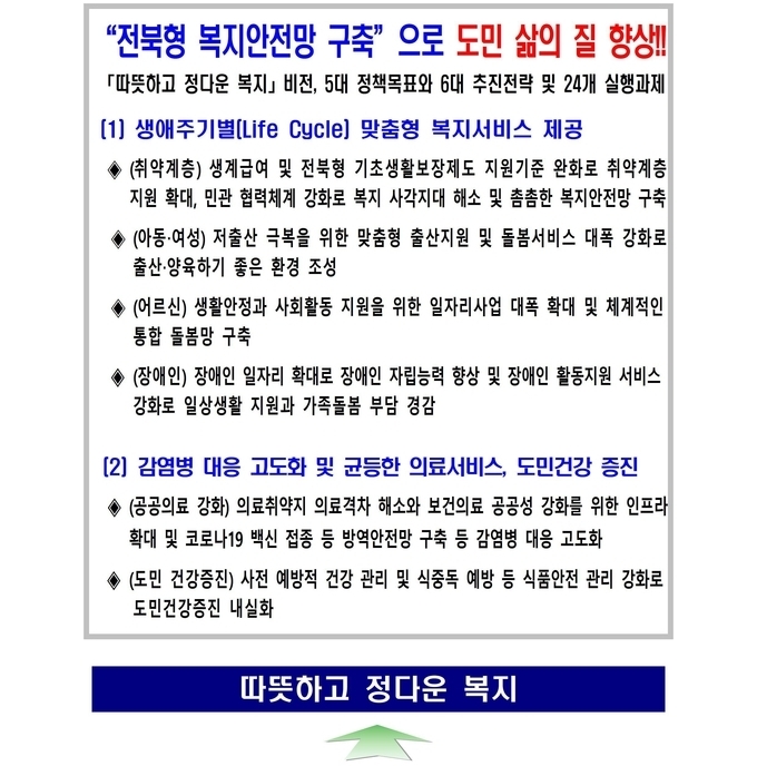 전라북도 복지여성보건국은 올해「따뜻하고 정다운 복지」실현을 비전으로 5대 정책목표와 6대 추진전략 및 24개 실행과제를 중점 추진할 계획이다.