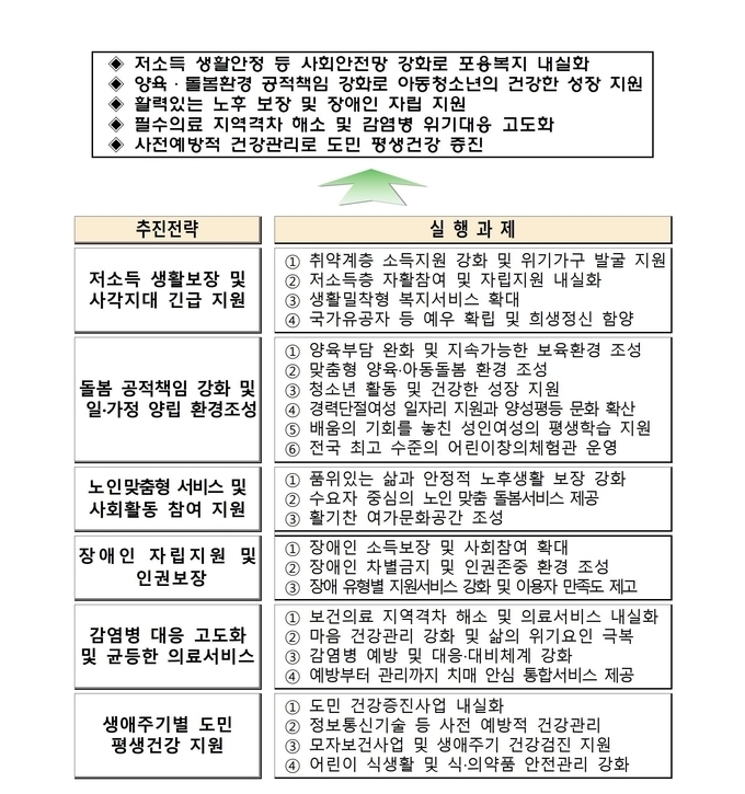 5대 목표로 ❶ 저소득 생활안전 등 사회안전망 강화로 포용복지 내실화, ❷ 양육‧돌봄 환경 공적책임 강화로 아동청소년의 건강한 성장지원, ❸ 활력있는 노후보장 및 장애인 자립지원, ❹ 필수의료 지역격차 해소 및 감염병 위기대응 고도화, ❺ 사전 예방적 건강관리로 도민 평생건강 증진을 통해 도민의 삶의 질을 향상시킨다.