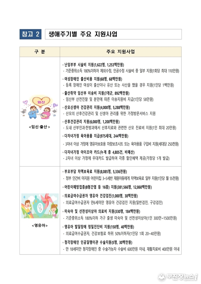 난임부부 시술비 지원 및 산모·신생아 건강관리 지원 등 임산부 건강관리(12,016명→12,348명), 산후 건강관리를 위한 의료비 지원(1인 20만원, 6,000명) 등을 통하여 아이 낳기 좋은 환경을 조성한다.
