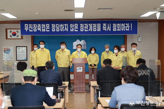 진안군이 15일 군청 상황실에서 진안군의회 의원 및 실과소장 등이 참석한 가운데 무진장축협의 정관개정 철회를 촉구하는 성명서를 발표했다.