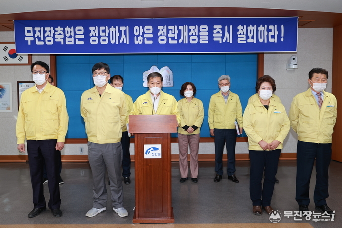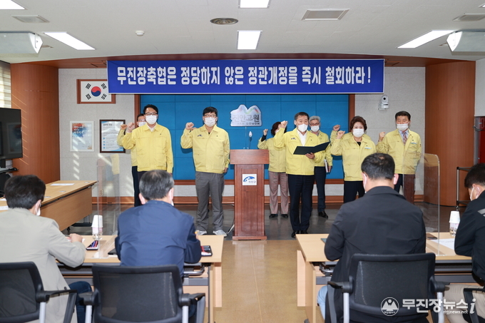 이어 진안군의회 박관순 의원은 “더 이상의 부적절한 정관변경 시도를 중단하라.” 며 “그럼에도 무진장축협이 편법 정관개정을 강행한다면 진안군의 요구가 관철될 때까지 진안지역 모든 조합원과 진안군민은 결코 좌시하지 않고 강력히 저지할 것.”이라고 말했다.