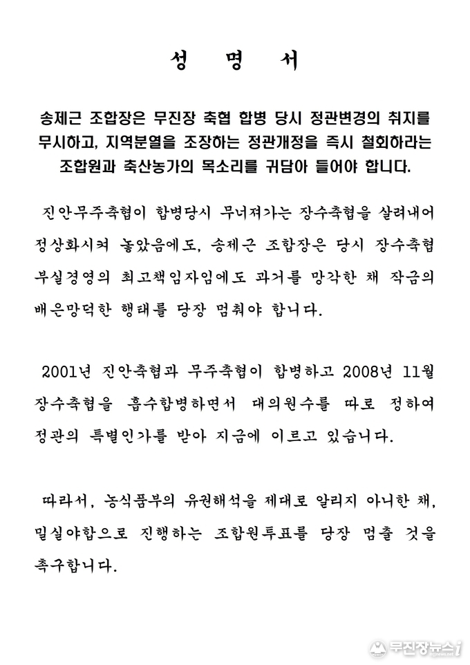 이어 그는 “무진장축협은 2001년 진안축협과 무주축협이 합병하고 2008년 장수축협을 흡수합병하면서 대의원수를 따로 정해 농림부(현 농식품부)로부터 정관의 특별인가를 받아 지금에 이르고 있다”며 “합병 당시 계약서의 유효성을 현재까지 인정한다는 농식품부의 유권해석을 제대로 알리지 않고 조합원 투표를 진행하고 있다는 것에 대해 우려를 표한다”고 말했다.
