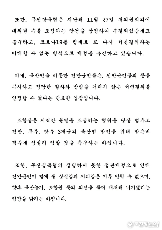 전 군수는 또 “지난해 11월 27일 대의원회의에 대의원 수를 조정하는 안건을 상정했다가 부결되었는데도 재차 서면결의라는 이해할 수 없는 방식으로 개정을 추진하고 있다”며 “축산농가와 진안군민들을 무시한 채 정당한 절차와 방법을 거치지 않는 서면결의는 인정받기 어렵다”고 강조했다.