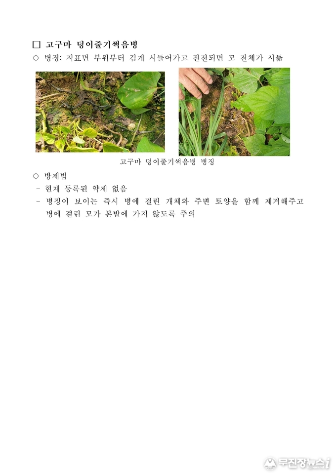 부패한 씨고구마를 묻은 자리에서는 곰팡이가 보이고 썩은 냄새가 나거나 모가 시들기 때문에 부패한 씨고구마와 주위 토양까지 함께 제거해주고 살균제를 처리한다.