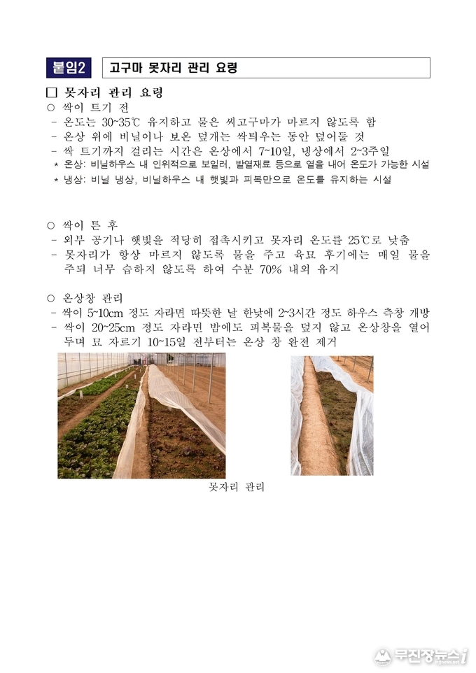 농촌진흥청은 씨고구마 씨뿌리는 시기를 맞아 건강한 모 생산을 위한 못자리 관리요령과 병해 예방법을 소개했다.