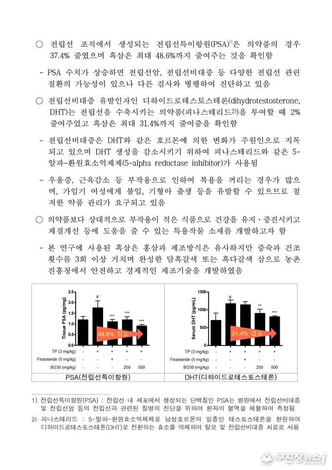 농촌진흥청 국립원예특작과학원 특용작물이용과 김금숙 과장은 “이번 연구는 인삼 소비 촉진에도 보탬이 될 뿐 아니라, 대부분 수입 원료에 의존하는 전립선 건강기능식품 원료시장의 대안이 될 수 있다.”라며 “흑삼이 건강기능식품 원료로 빠르게 등록될 수 있도록 인체 적용시험에도 최선을 다하겠다.”라고 전했다.