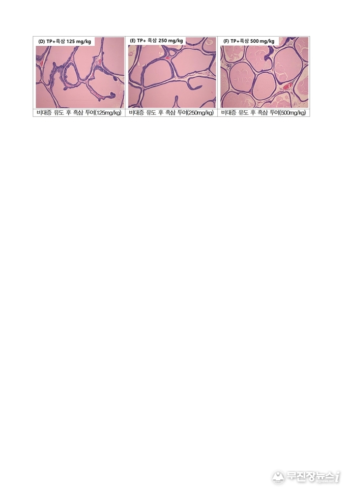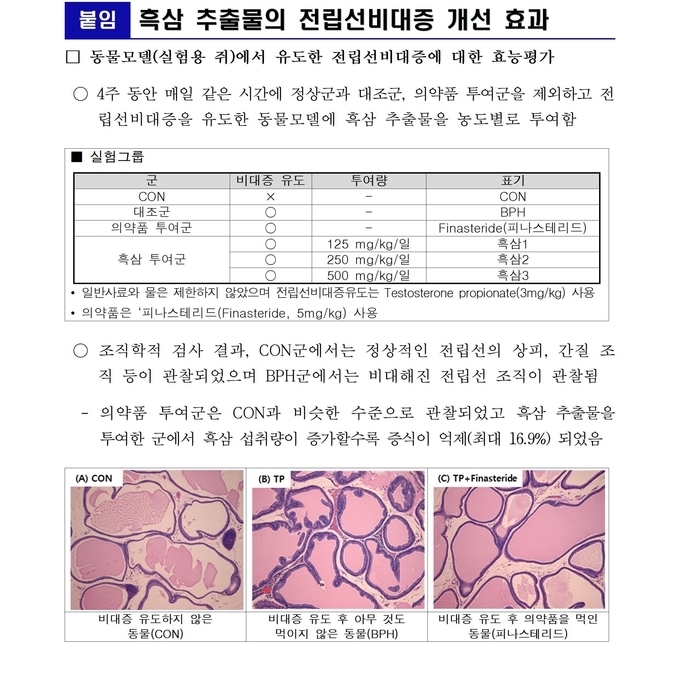 농촌진흥청은 전립선비대증을 유도한 동물모델에 4주 동안 매일 흑삼을 먹였다. 그 결과, 비대증을 유도한 뒤 흑삼을 먹이지 않은 동물모델과 비교해 전립선의 무게가 최대 16.9% 줄어드는 것을 확인했다.