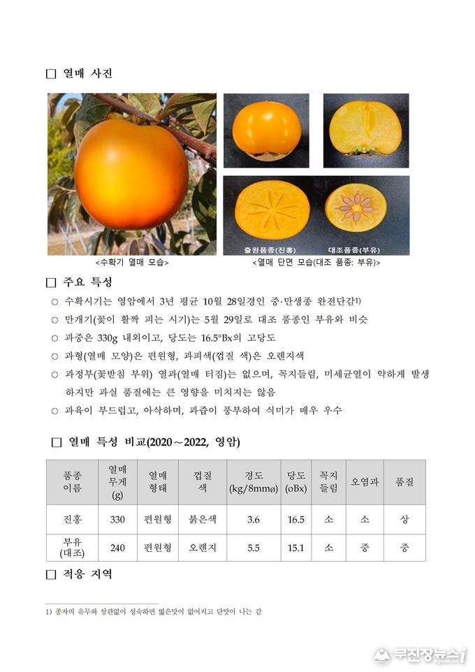 ‘진홍’은 ‘태추’와 ‘대안단감’을 교배해 2022년 최종 선발한 품종이다. 껍질이 얇아 먹기 편하고 달콤, 아삭한 맛이 일품이라 ‘진짜 단감(眞紅)’이란 뜻으로 이름을 붙였다.