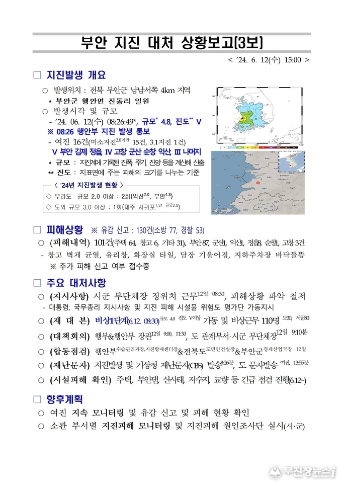 도, 6월12일 부안 지진발생 상황보고(15시 기준)