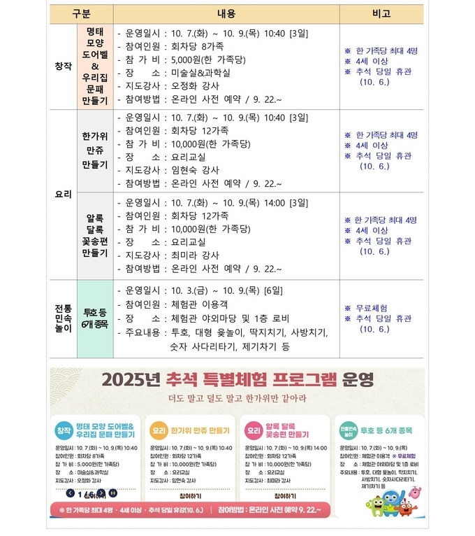 이번 추석 특별체험 프로그램은 △명태모양 도어벨&우리집 문패 만들기 △한가위 만쥬 만들기 △알록달록 꽃송편 만들기로 가족들이 함께 즐길 수 있는 다양한 활동으로 구성됐다. 희망자들은 온라인 사전 예약을 통해 참여할 수 있다.