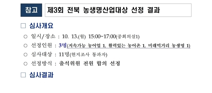 이번 대상은 ▲지속가능 농어업 ▲활력있는 농어촌 ▲미래먹거리 농생명 등 3개 부문에서 각 1명(단체)을 선정했다. 도는 지난 7월 16일부터 9월 5일까지 52일간 시‧군을 통해 후보자를 추천받아 현지조사와 심사를 진행했으며, 현지조사 통과자 11명을 대상으로 10월 13일 열린 심사위원회에서 최종 수상자를 확정했다. 시상식은 오는 11월 7일 ‘전북농업인의 날’기념식에서 상패와 메달이 수여될 예정이다.