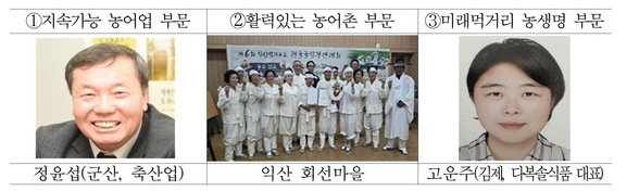 지속가능 농어업 분야 수상자로 선정된 군산 한우농가 정윤섭 씨는 전국한우협회 전북도지회장을 역임하며 한우 수급조절과 고급육 차별화를 선도하여 한우산업 경쟁력 강화에 기여했다는 평가를 받았다. 특히 고능력 암소축군 조성사업을 주도해 한우 개량 기반을 확립하고 품질 고급화와 생산성 향상을 동시에 이뤄낸 공로가 인정됐다.