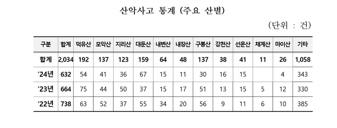 최근 3년간(2022~2024년) 도내 산악사고는 총 2,034건으로, 이 중 9월과 10월 두 달간 발생한 사고가 400건 이상(전체의 약 20%)을 차지한 것으로 나타났다.