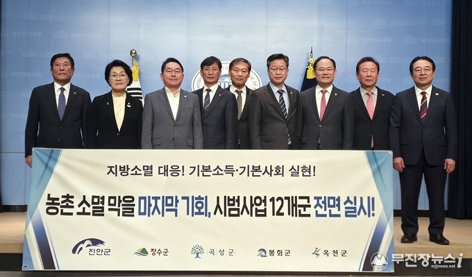진안군(군수 전춘성)은 29일 국회에서 장수군(군수 최훈식)·곡성군(군수 조상래)·봉화군(군수 박현국)·옥천군(군수 황규철)과 함께 기자회견을 열고, 정부가 추진 중인 농어촌 기본소득 시범사업을 1차 심사를 통과한 12개 군 전 지역에서 전면 시행 할 것을 촉구했다.
