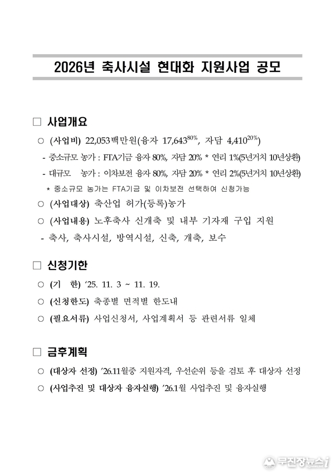 전북특별자치도는 축산업 경쟁력 강화를 위해 ‘2026년 축사시설 현대화사업’ 신청을 오는 11월 19일까지 받는다. 이번 사업은 노후 축사를 신축하거나 개보수하고 스마트 축산 시설을 구축하는 데 필요한 자금을 지원하여, 보다 쾌적하고 효율적인 축산 환경을 조성하는 것을 목표로 한다.