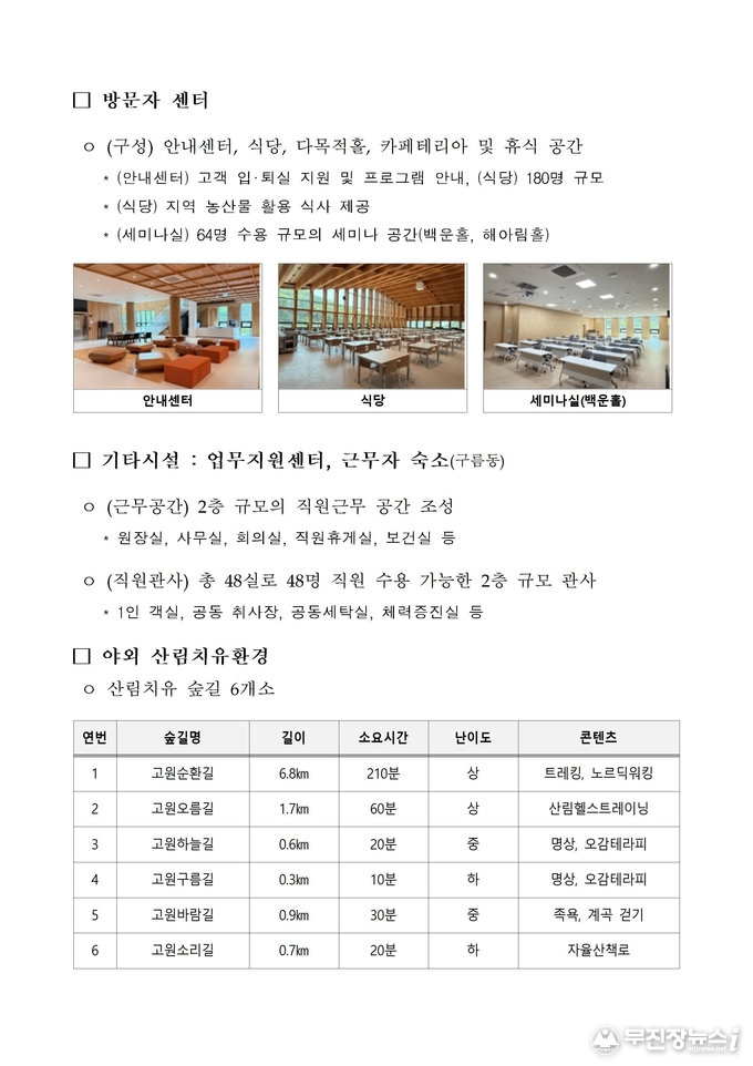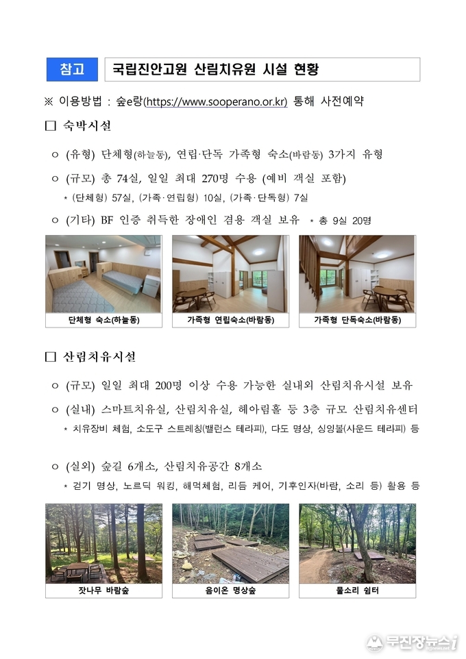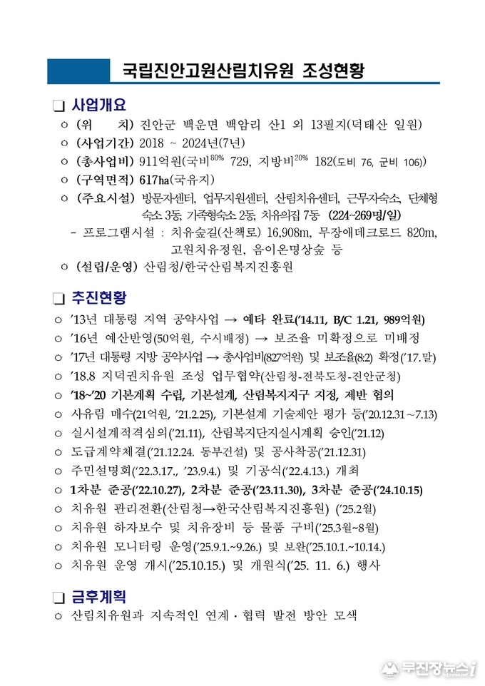 국립진안고원산림치유원은 산림청이 조성한 제2호 국립 치유원으로, 2018년 설계를 시작해 약 7년간의 사업기간 끝에 지난해 10월 준공됐다. 총사업비 911억 원(국비 80%, 지방비 20%)이 투입되어 치유센터, 숙박동(74실), 치유숲길(11km) 등 다양한 인프라를 갖췄으며, 장·단기 체류형 산림치유 프로그램을 운영한다.