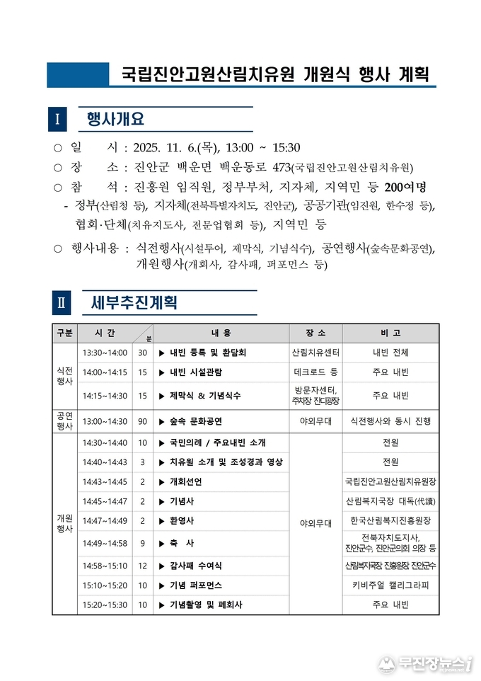 김관영 도지사는 “국립진안고원산림치유원이 국민에게는 건강과 희망을 선물하는 치유의 숲으로, 전북도민에게는 새로운 활력을 불어넣는 상생의 장이 되길 기원한다”고 밝혔다.