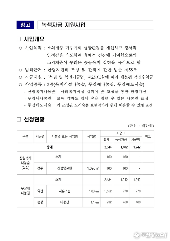 송금현 전북특별자치도 환경산림국장은 “복권기금을 활용한 녹색복지 사업은 환경과 돌봄이 결합된 사회적 가치 확산에 중요한 역할을 한다”며 “앞으로도 누구나 숲의 혜택을 편리하고 안전하게 누릴 수 있도록 나눔숲과 무장애 나눔길을 지속적으로 확대하겠다”고 밝혔다.