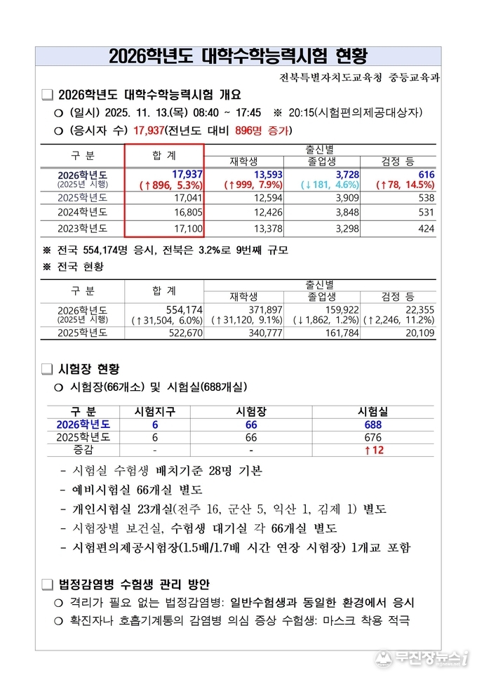 한편 이날 수능은 전주·군산·익산·정읍·남원·김제 등 도내 6개 시험지구, 총 66개 시험장에서 치러진다.